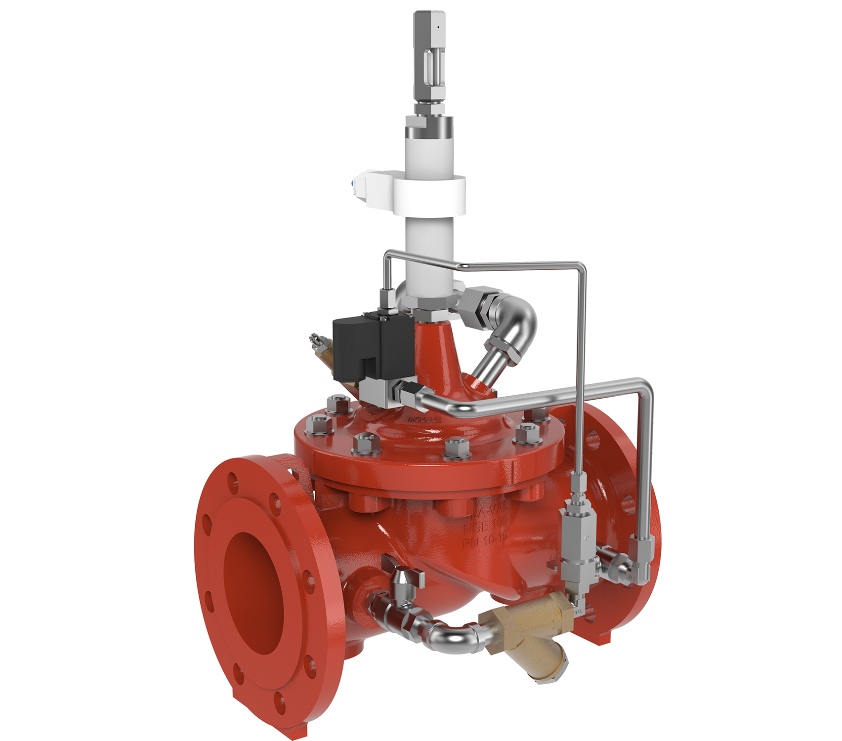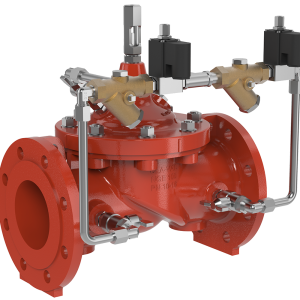 In case of a power failure (P2 >P1), the Hydraulic Check Feature immediately closes the valve in order to protect the pump. The Pressure Relief Valve or Surge Anticipator Valve is usually combined with the pump control valve in order to dissipate surge pressures.